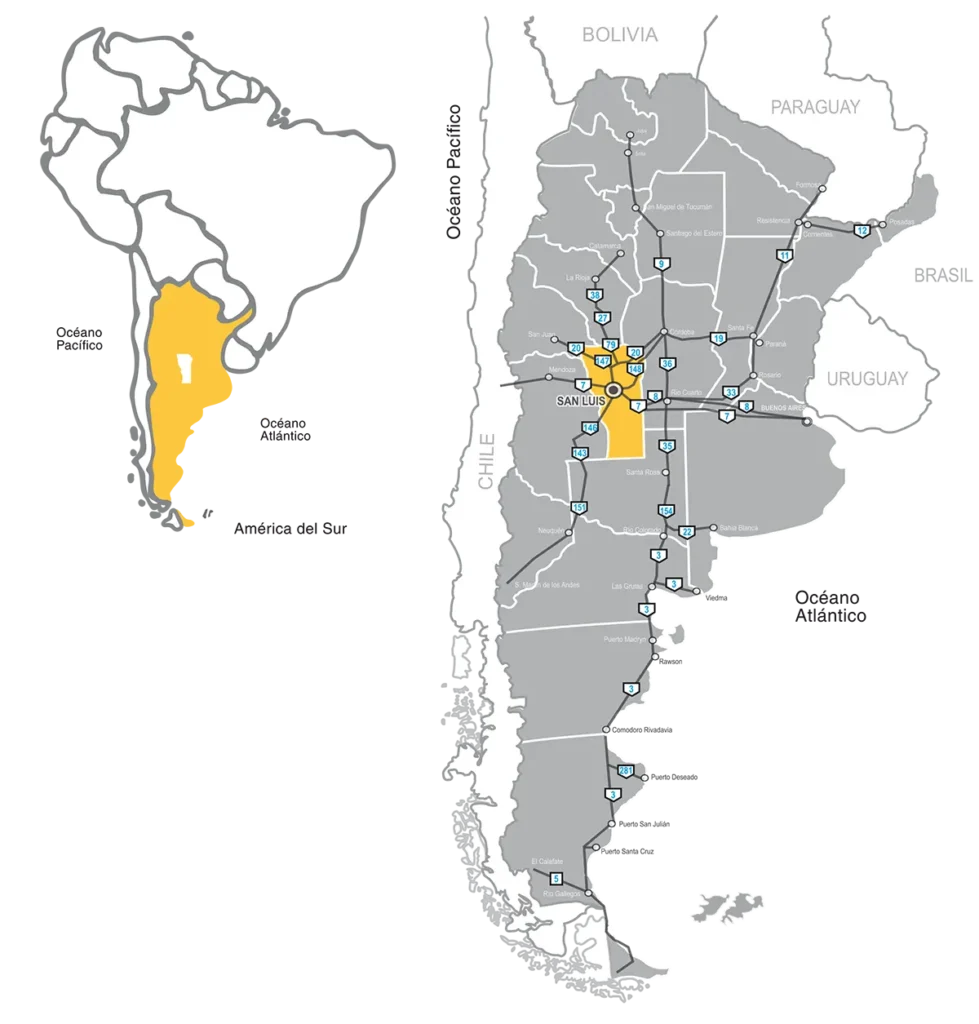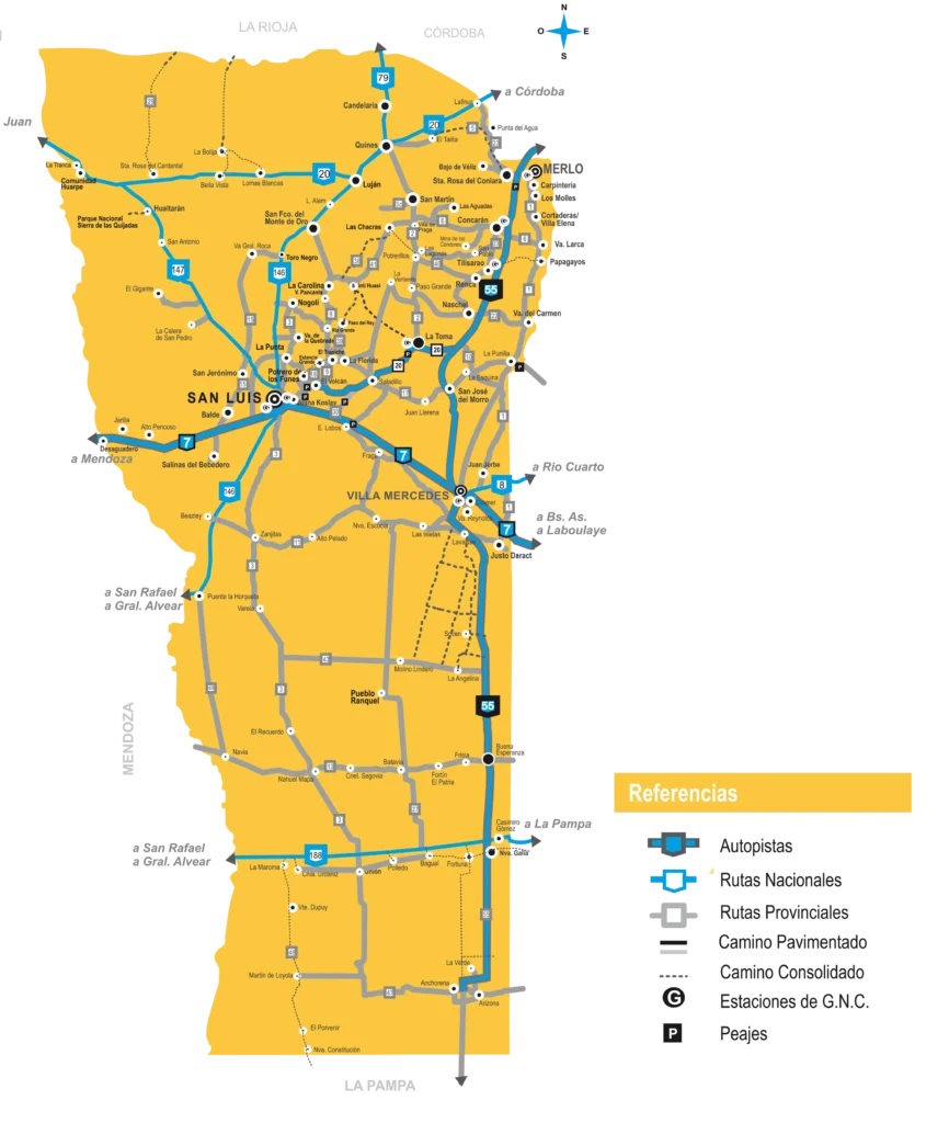 Por su privilegiada ubicación en el centro-oeste de la República Argentina, la Provincia de San Luis se destaca por su amplia conectividad, tanto con importantes provincias y ciudades, como con países limítrofes, mediante rutas y autopistas.